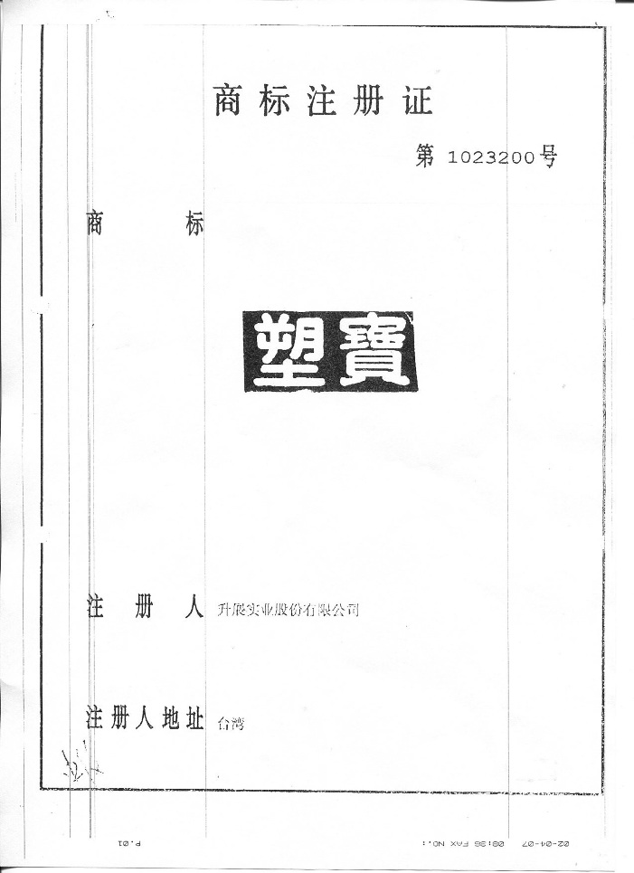下列各式商標為本公司于大陸取得之商標注冊,僅授權太倉市塑寶環保機械及增城市升展機械公司使用,其余非經我司書面許可而濫用者,本公司將采取法律行動,追索侵權之損害賠償。